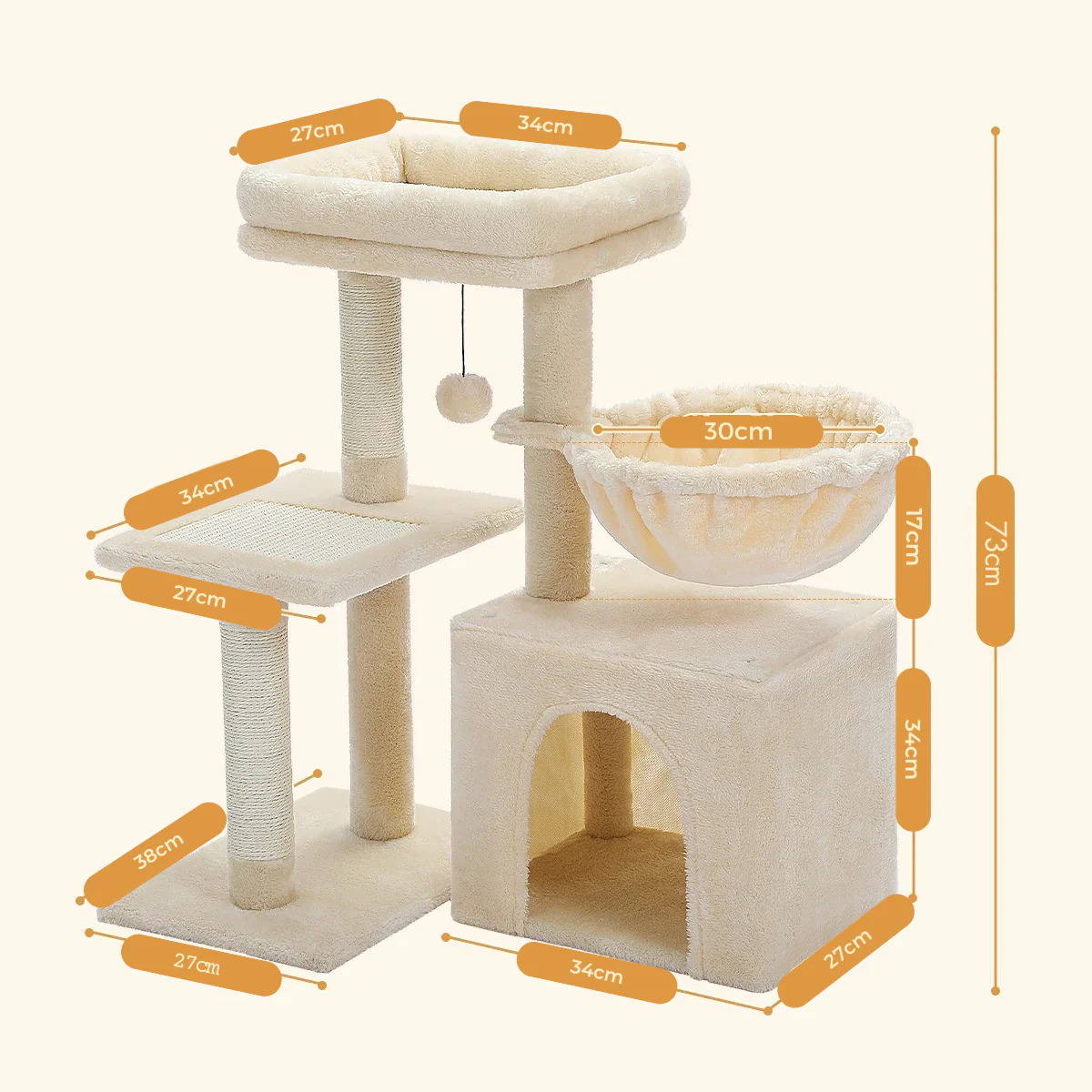 Avec son design ingénieux et sa conception en matériaux de haute qualité, l’aire de jeu pour chats deviendra rapidement un élément central dans la vie de votre compagnon. Fabriqué avec soin, il offre à la fois un espace ludique et un refuge sécurisé, répondant aux instincts naturels des félins. Les griffoirs intégrés offrent une alternative durable aux meubles pour que votre chat puisse aiguiser ses griffes, tandis que le hamac suspendu et les différents niveaux apportent un terrain parfait pour jouer, grimper ou se reposer.
